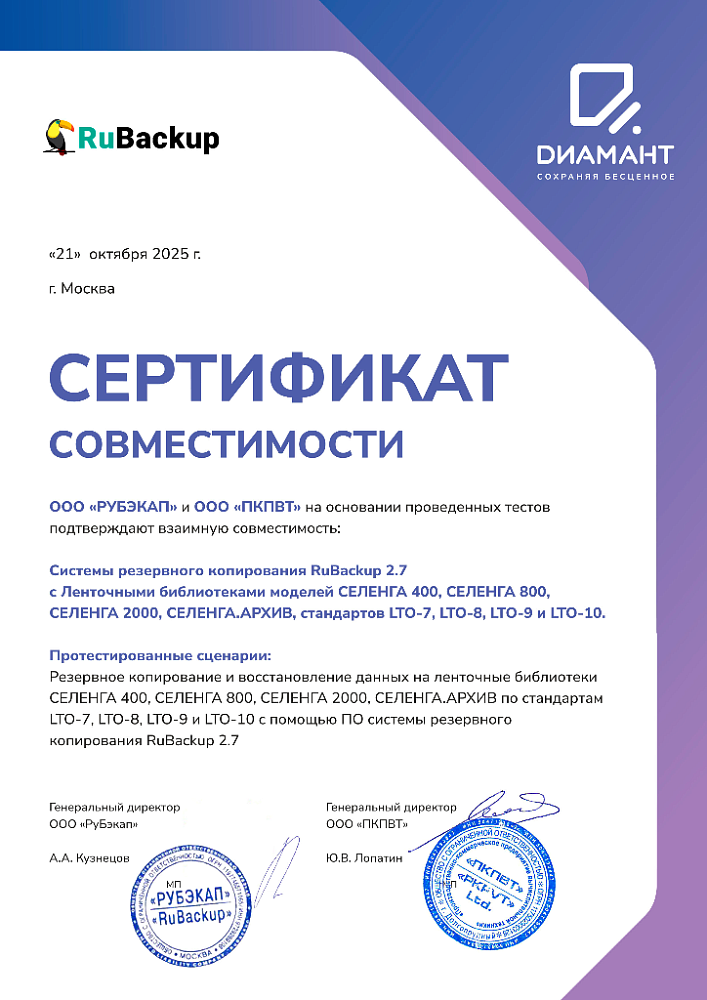 Надежность хранения резервных копий повышается за счет совместного использования ленточных библиотек ДИАМАНТ «СЕЛЕНГА» и системы резервного копирования RuBackup 2.7 компании «РУБЭКАП».
